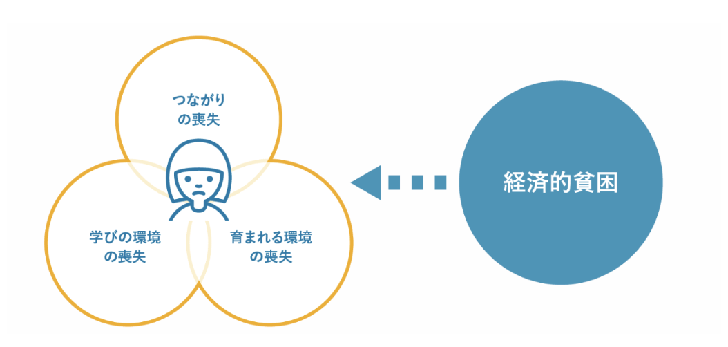 経済的困窮を背景として、子どもが健全に育ち自立するために必要な「つながり」や「育まれる環境」「学びの環境」が喪失しやすくなっています。虐待・不登校・非行・自殺の問題は、経済的困窮を基盤とし、「つながり」「育まれる環境」「学びの環境」の喪失が複雑に絡み合っているのが現状です。