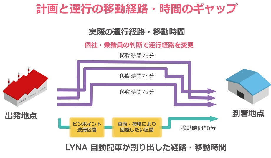 「LYNA 自動配車クラウド」は、配車計画の作成にあたって独自AIを搭載しており、車両台数や燃料費などの輸配送コストを重視した利益の出せる配車計画を高速で立案できる製品で、配車にかかる人材不足への課題解決にも寄与しています。一方で、ユーザーからは計画と運行実態で移動経路・時間に差があり、計画通り車両を運行することが難しいとの意見を頂くことがありました。これは運行時に計画で想定していない渋滞に遭遇したり、ユーザーが車両や荷物に合わせ遠回りでも安全な経路を選択するといった行動を取ることが原因の一つです。