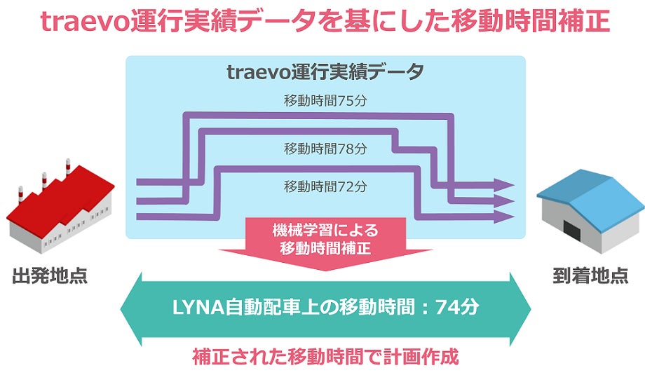 今回、「traevo」との連携により、「traevo」が収集する自社・配送委託先が実際に走行した運行実績データを配車計画に反映できるようになり、より実態に即した移動時間補正を行えるようになります。「LYNA 自動配車クラウド」ユーザーは自社が管理する車両の「traevo」運行実績データを利用することで、より個社の事情に合わせた配車計画にしていくことが可能です。