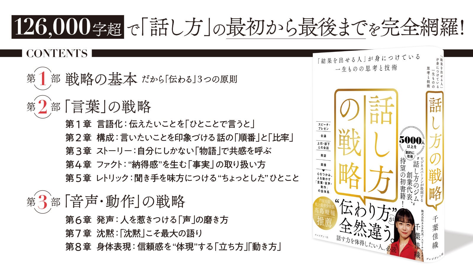 AIが台頭する時代にあっても、人と人とのコミュニケーションの重要性は揺らぎません。本書は、ビジネスにおける取引先との商談やプレゼン、上司・部下との〝報連相〟、会議、就職や転職の面接、結婚式の祝辞まで、「話す」という行為を通じてなにかを成し遂げようとするシーンのすべてにおいて役立つ決定版。合計約12万字超のボリュームでまとめあげた、まさに一生ものの一冊です。