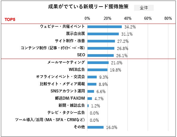 最も効果を上げた施策として「ウェビナー・共催イベント」が34.2%で1位に。オンラインイベントが引き続き強力なマーケティング手法として支持されています。ただし、予算規模による成果の差が大きく、質の高いイベント実施には一定以上の予算(集客費、運営費、登壇者確保など)が必要なことが示唆されました。