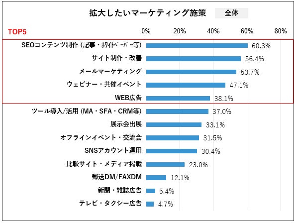 60%以上の企業が2025年SEOコンテンツに注力すると回答。WEBサイト上でのリード獲得は一層の競争激化が予想され、より専門性の高い、独自の知見を含むコンテンツの重要性が増す一年となりそうです。拡大したい上位5つの施策を見ると、多くの企業が単独チャネルではなく、複数チャネルでの複合的なアプローチを意図しており、SEO、サイト改善、メールマーケティング施策による長期的な顧客関係構築を重視していることが明らかになりました。