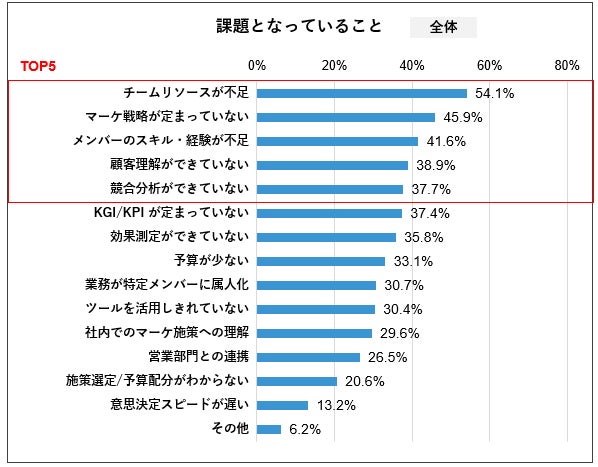 予算にかかわらず企業の54.1%が「チームリソースの不足」を最も重要な課題として挙げました。続いて、「戦略の不明確さ」や「メンバーのスキル不足」、「顧客理解」も上位にランクインし、予算だけでは解決できない本質的な課題が存在することが明らかになりました。