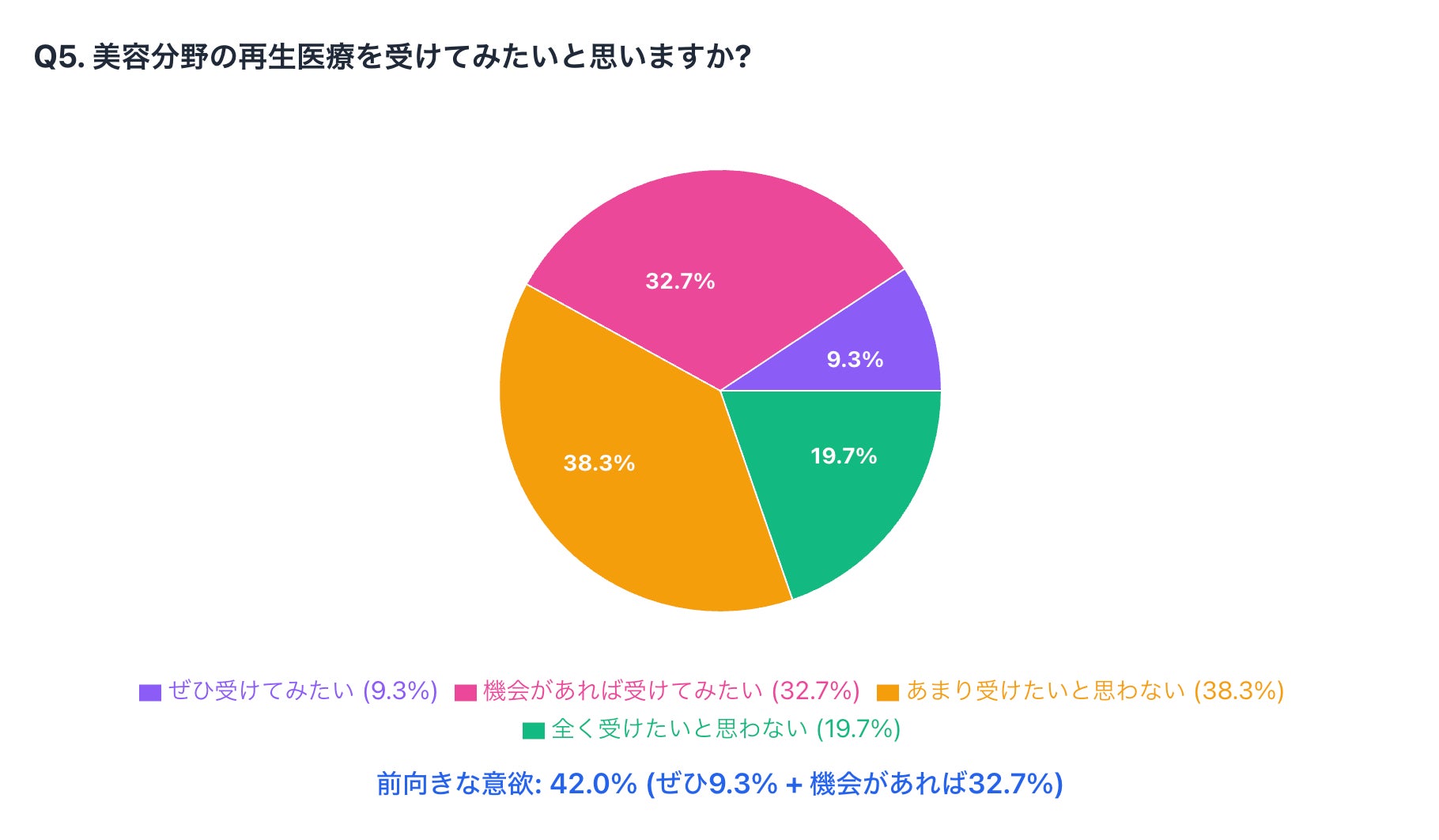利用していない最大の理由は「価格の高さ」で68%を占め、次いで「効果への疑問」(51%)、「安全性への不安」(42%)となりました。一方で、「シワ・たるみ改善」や「肌の若返り効果」など、エイジングケアへの期待は非常に高く、約4割の方が再生医療を受けてみたいと考えています。