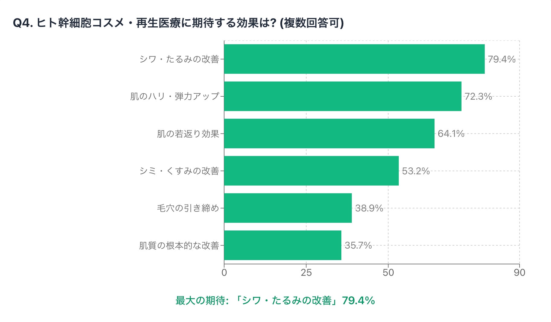 その結果、最も期待されているのは「シワ・たるみの改善」で約79%、次いで「肌のハリ・弾力アップ」(72%)、「肌の若返り効果」(64%)となり、エイジングケア効果への期待が非常に高いことが分かりました。
