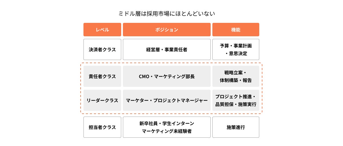 しかし、蓋を開いてみるとほとんどの企業が「戦略立案ができる人材がいない」「プロジェクト推進できる中核人材がいない」「採用がうまくいかない」という、体制構築における悩みが課題の本質でありました。人材採用難のこの時代、希少性の高いBtoBマーケティングの経験者層(ミドル層)はほぼ市場におらず、事業責任者や経営者などの決裁者クラスと、マーケティング未経験の担当者クラスで「とりあえず施策を実行している」というケースがほとんどでした。