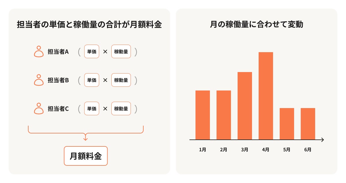 マーケティングスタジオは担当者の可動量に合わせて月額料金が変動する従量課金モデルとなります。携帯料金のようにたくさん稼働した月は料金が上がり、閑散期や稼働を抑えたい時は低額で利用することができます。