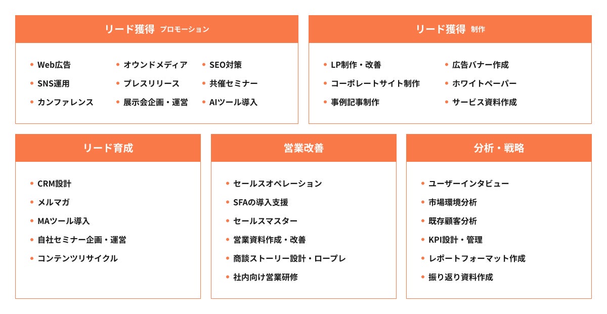 マーケティングスタジオはBtoBマーケティングに特化しているので、あらゆる施策の実行代行が可能です。また、プロジェクトのフェーズに合わせて柔軟に体制変更が可能なため、必要な人材を必要な時に活用することができます。