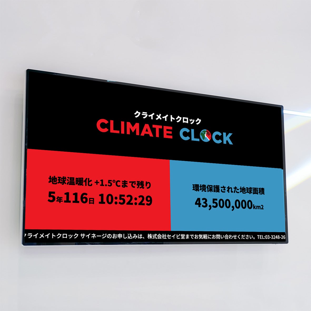 現在は、気候危機による壊滅的な地球の未来を回避するため、【クライメイトクロック 】カウントダウンタイマー デジタルサイネージ用コンテンツをお申込みいただいた皆様全員に無償提供をしています。