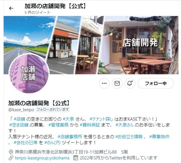 中でも空き店舗でお困りの大家さんと出店場所をお探しの企業様の架け橋となるような加瀬の店舗開発の【公式】SNSです。入居テナント様の状況をはじめ、お役立ち情報、募集物件などツイートして参ります。この機会にぜひ「いいね!」や「フォロー」をお願い致します。