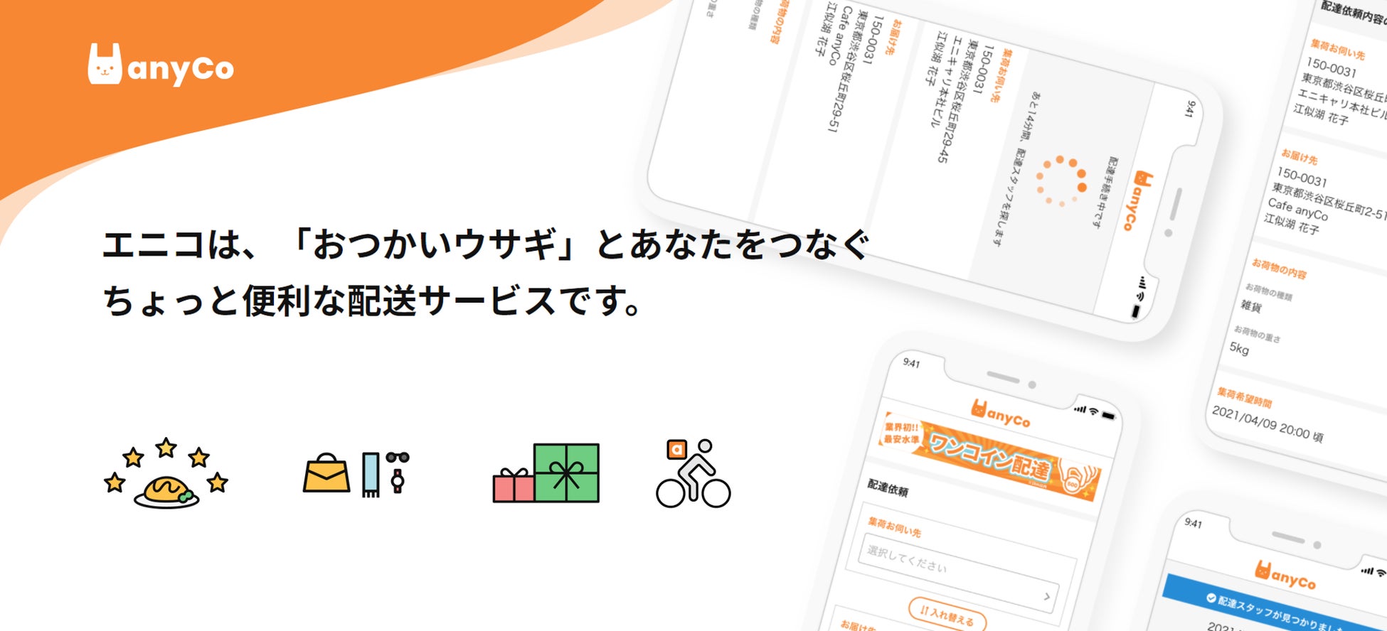 ラストワンマイルに特化した物流ソリューションを提供する株式会社エニキャリ(以下、当社)は、近距離おつかいサービス「anyCo(エニコ)」のβ版アプリを公開しました。「anyCo」は、近距離間で今すぐ届けてほしいモノの即時配送をスマホアプリで手軽に依頼できるサービスです。本β版では、製品版アプリの提供開始に向けて、安定稼働やベネフィットを検証します。合わせて現在、配達パートナーを募集中です。