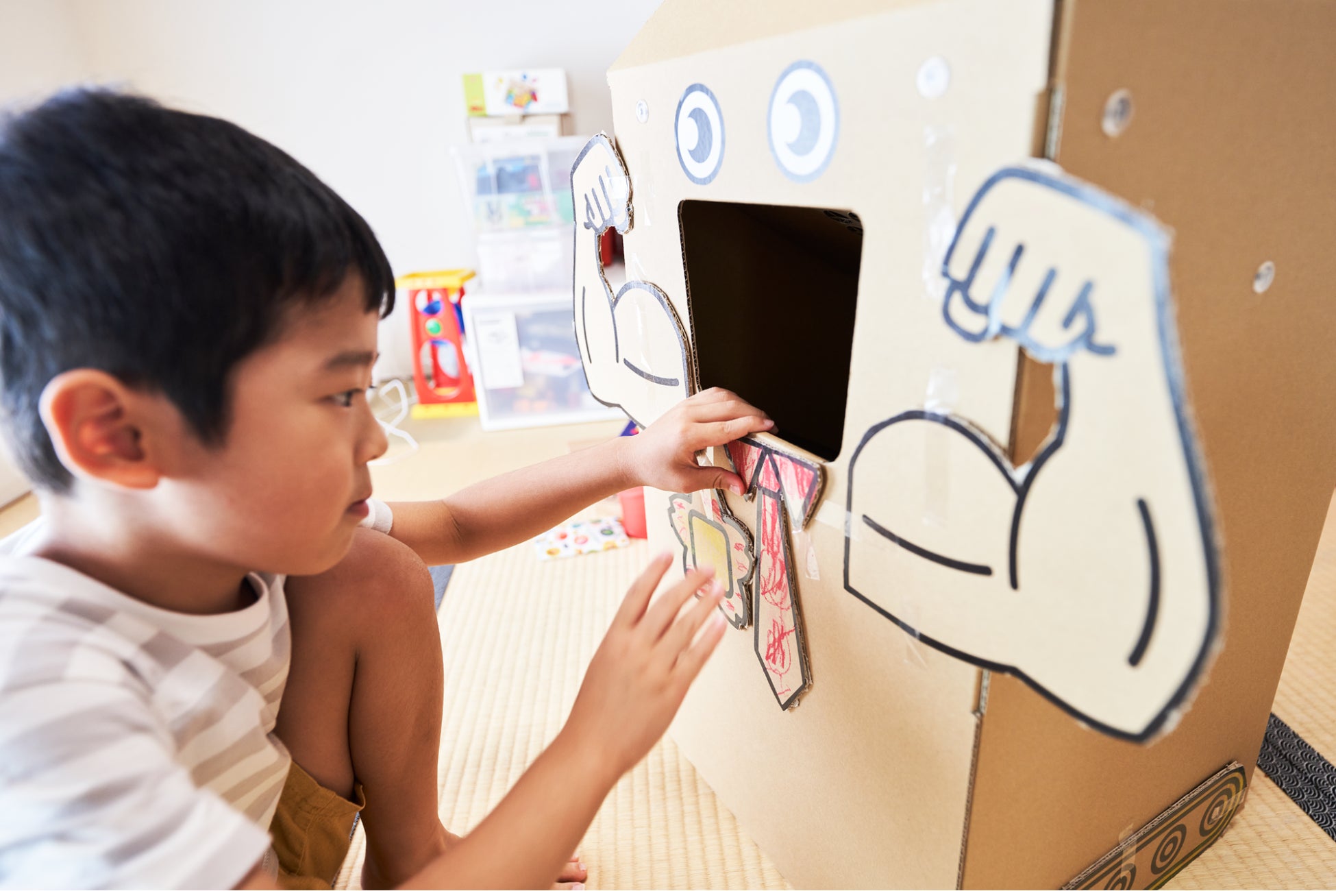 筐体のダンボールは、親子で組み立てて命を吹き込むというアイデアを持たせており、腕や羽などのパーツのイラストをプリントして、自分だけのモンスターをアレンジすることができます。目入れで魂を入れて完成させるといった、愛着を持たせることも可能です。