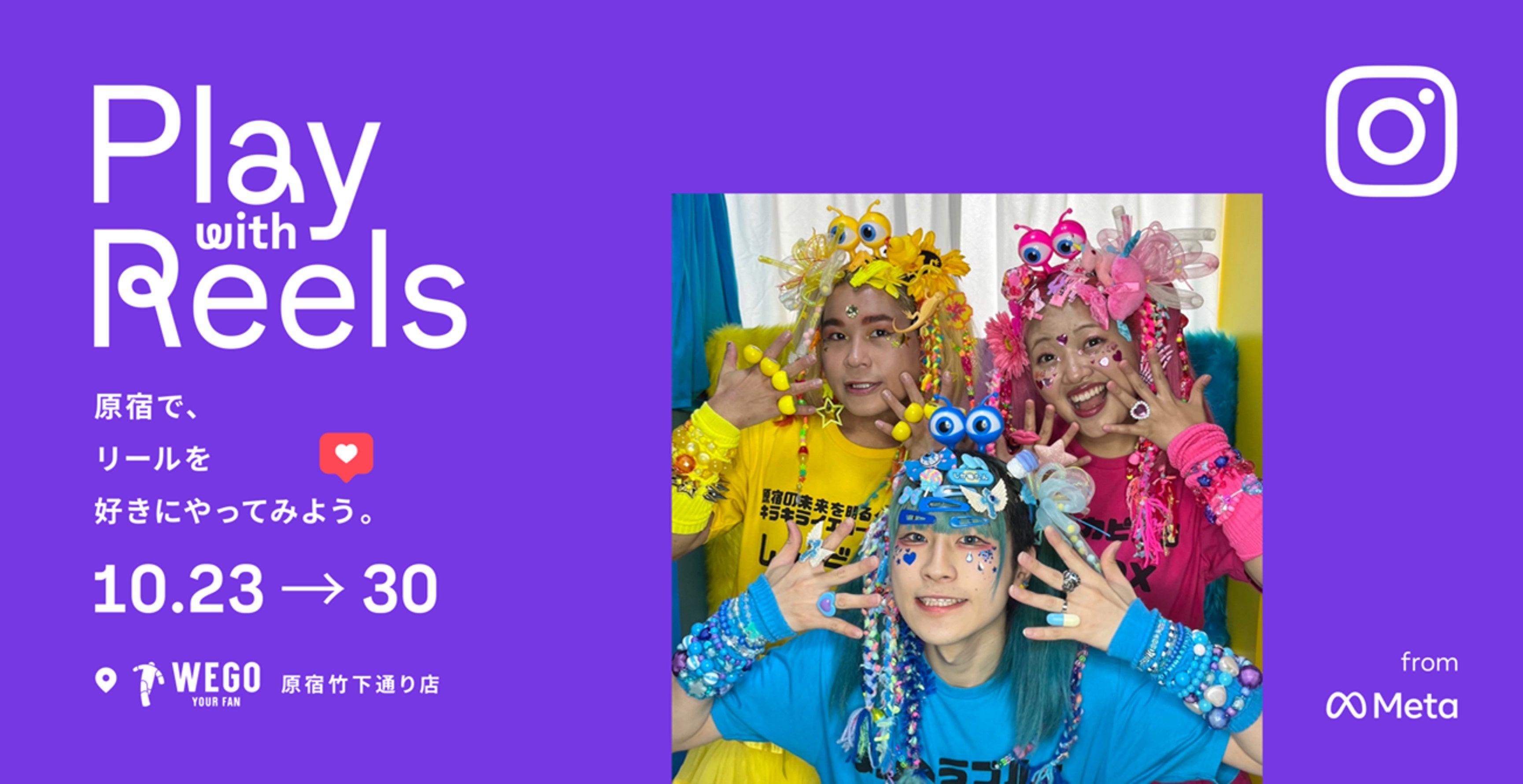 この度、株式会社ウィゴー(本社:東京都渋谷区恵比寿 代表取締役社長:園田恭輔)では、Instagramが行っている“リールをもっと自由に、クリエイティブに楽しむ”ことをテーマにしたキャンペーン「好きにやってみよう。」の一環として2022年10月23日(日)から2022年10月30日(日)までの期間、WEGO 原宿竹下通り店にてオフラインイベントを共同開催致します。