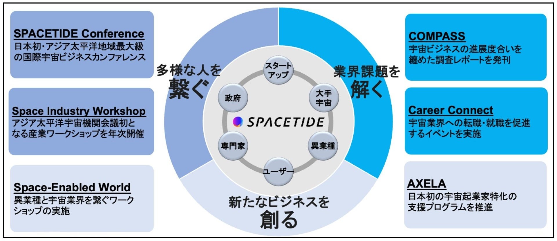 一般社団法人SPACETIDEは、2015年から「日本および世界の新たな宇宙産業の発展」をビジョンに掲げ、産業横断的な取り組みを通じて宇宙ビジネス全体の底上げを図り、新たな宇宙ビジネスの道筋を創り出すために活動している団体です。2015年から毎年、日本発の国際宇宙ビジネスカンファレンス「SPACETIDE」を主催しています。