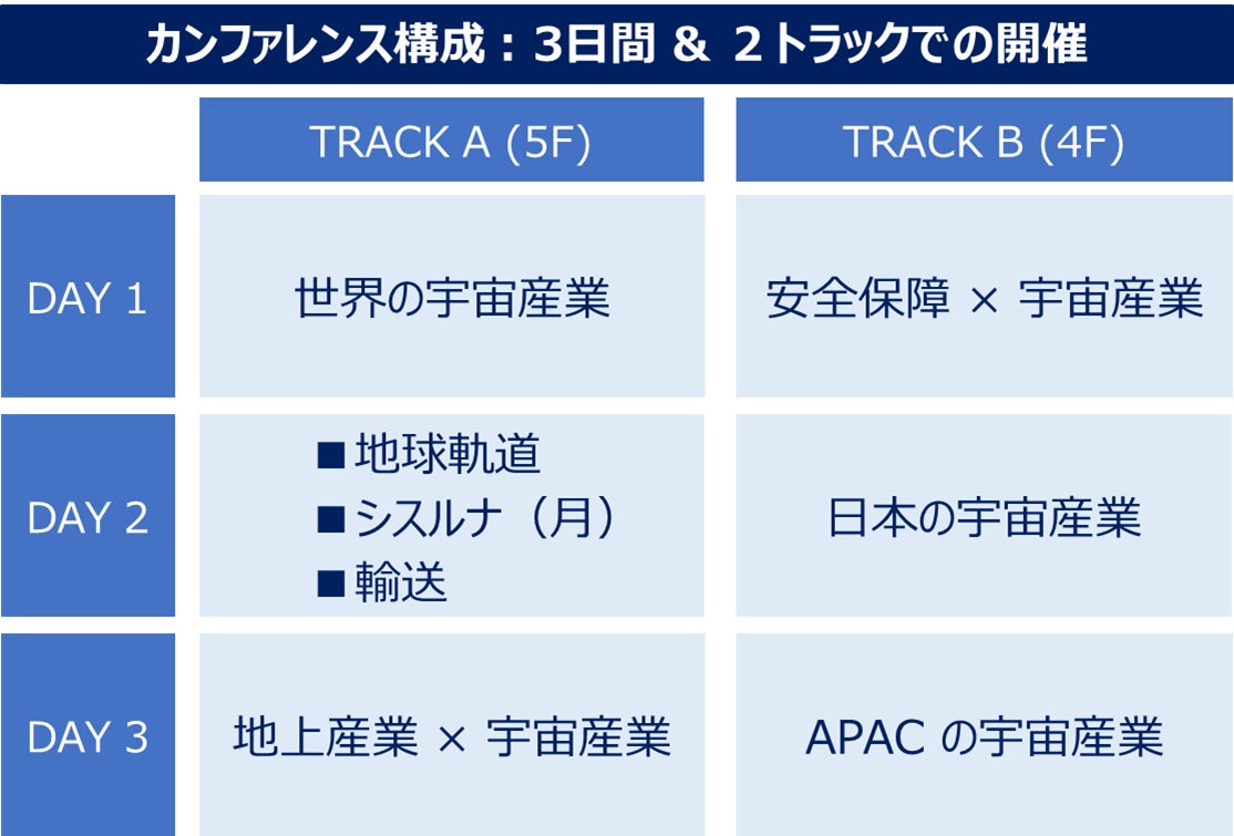 約50のセッションを通じて、世界とアジア太平洋地域、安全保障と商業宇宙、宇宙産業と地上産業などの掛け合わせを議論するとともに、商業宇宙ステーション、シスルナ経済圏、宇宙ビジネス人材などの最先端トピックも議論します。