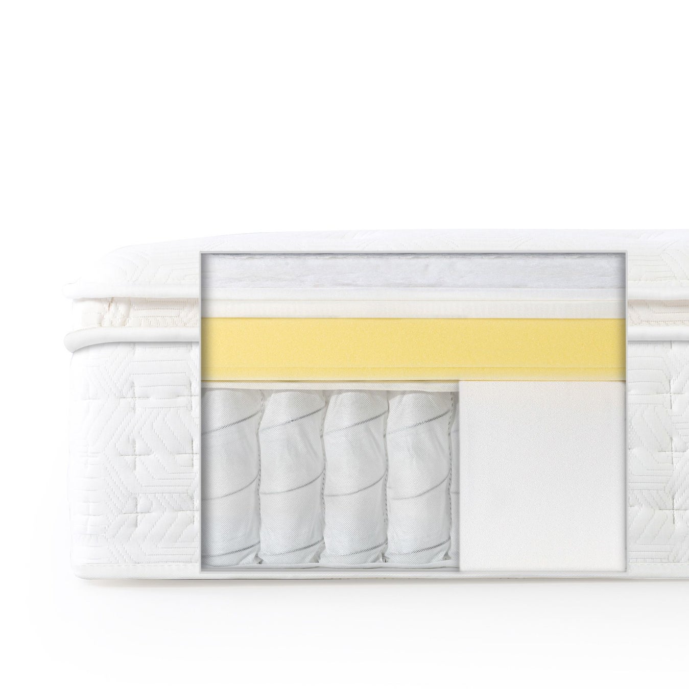 ①高密度のウレタンフォームと7.5インチのポケットコイルを組み合わせたハイブリット構造。ZINUSの独立コイルシステムは、並列に配列され、通気性に優れています。また、体を適度な硬さで支えて理想の寝姿勢を実現します。マットレスの基礎となる高密度ウレタンを使用したフォーム層は体圧分散に優れ、長期間快適な睡眠環境を保ちます。