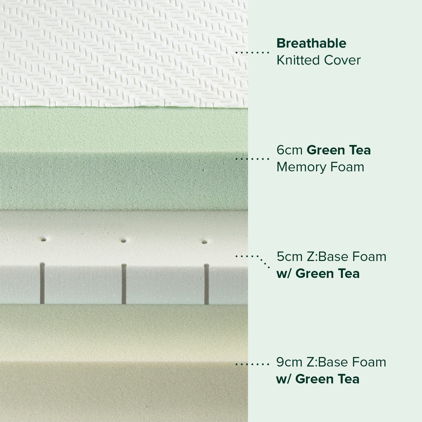③2層目と3層目には、緑茶成分と炭成分が注入されたGreenTeaメモリーフォームを使用。緑茶や木炭成分が、抗菌・脱臭・湿度調整に寄与し、マットレスを清潔な状態に保ちます。
