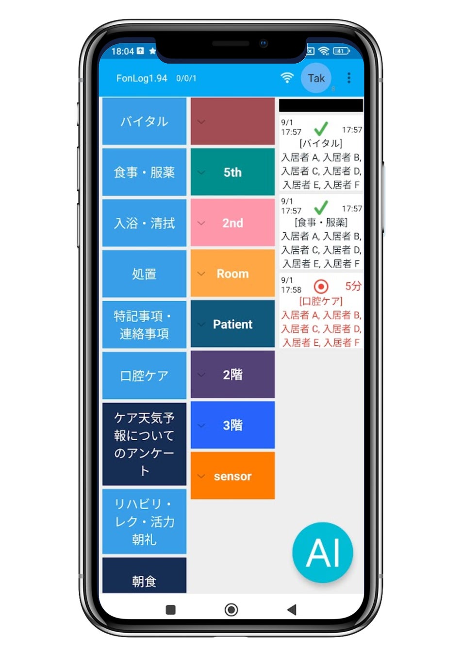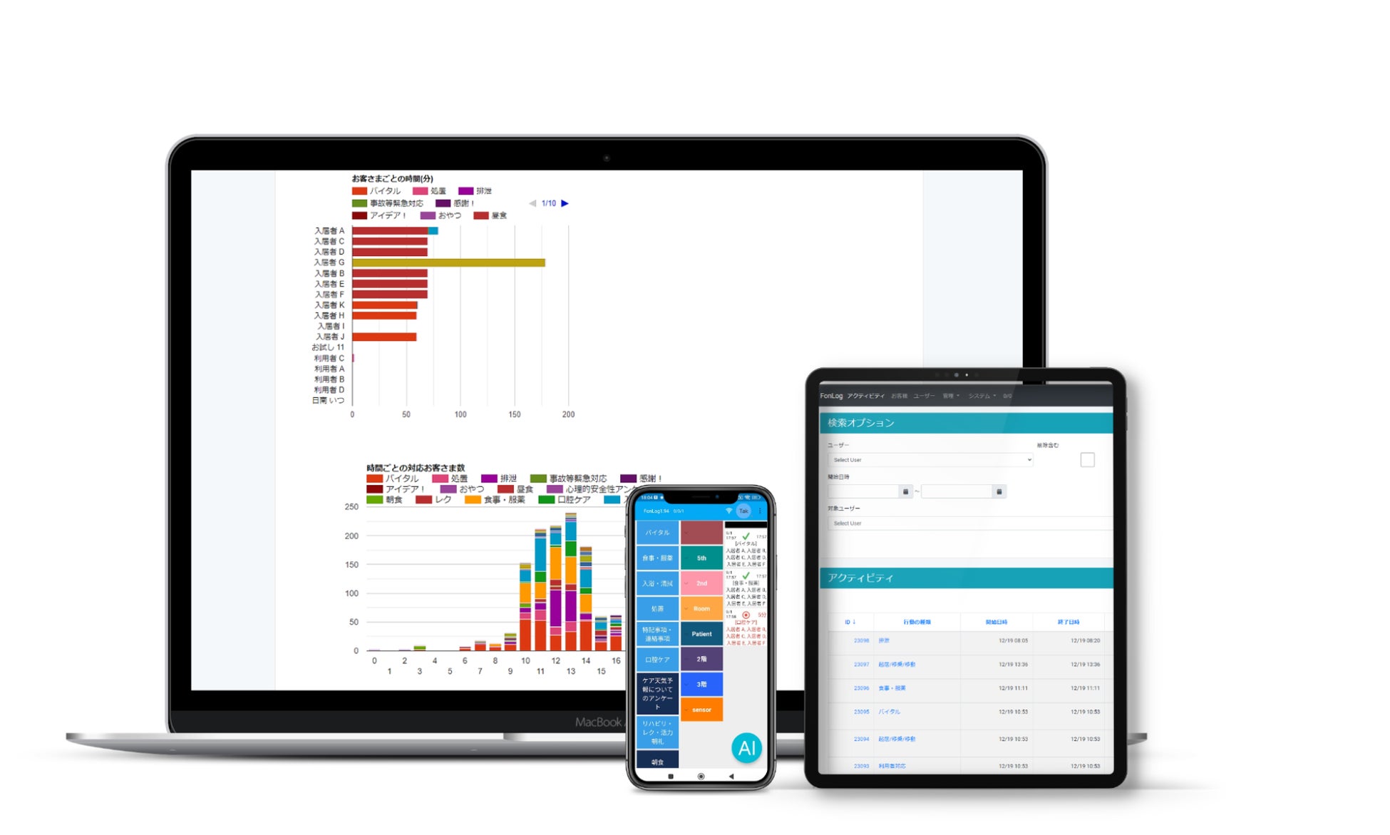 FonLogは、時間の測定ができ、その時のケア記録がその場で残せます。