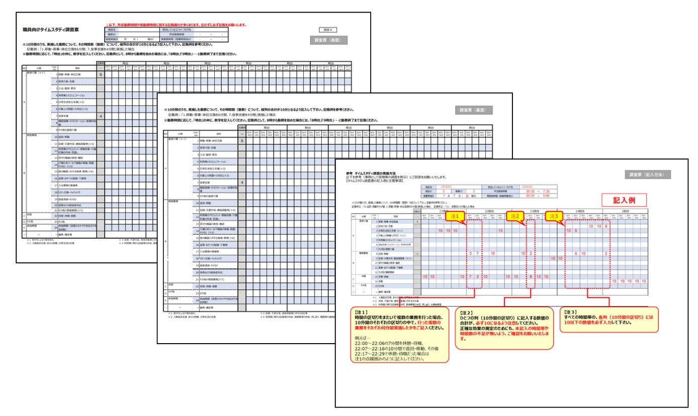 職員向けタイムスタディ調査票は、24項目について、10分刻み1分単位で、日中の時間帯、夜間の時間帯それぞれについて、複数人の介護職員の実勤務時間(残業時間含む)を調査の対象とし、5日間の自記式又は他記式によるタイムスタディ調査を実施することとされています。