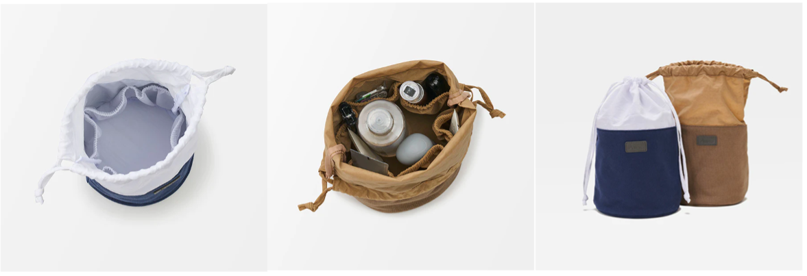 スキンケアやヘアケア、メイクアイテムなどを立てたまま収納できる便利なポーチ。どこに何があるか一目でわかるので出し入れしやすく、準備の時も旅行先でも使いやすい設計となっています。内側にはポケットが全面に搭載されており、ブラシや小さなものも仕分けて整理整頓が可能。大容量の収納力とキュートな巾着デザインが特徴です。素材には環境に優しく、軽量で型崩れしにくい再生ポリエステルを使用しています。