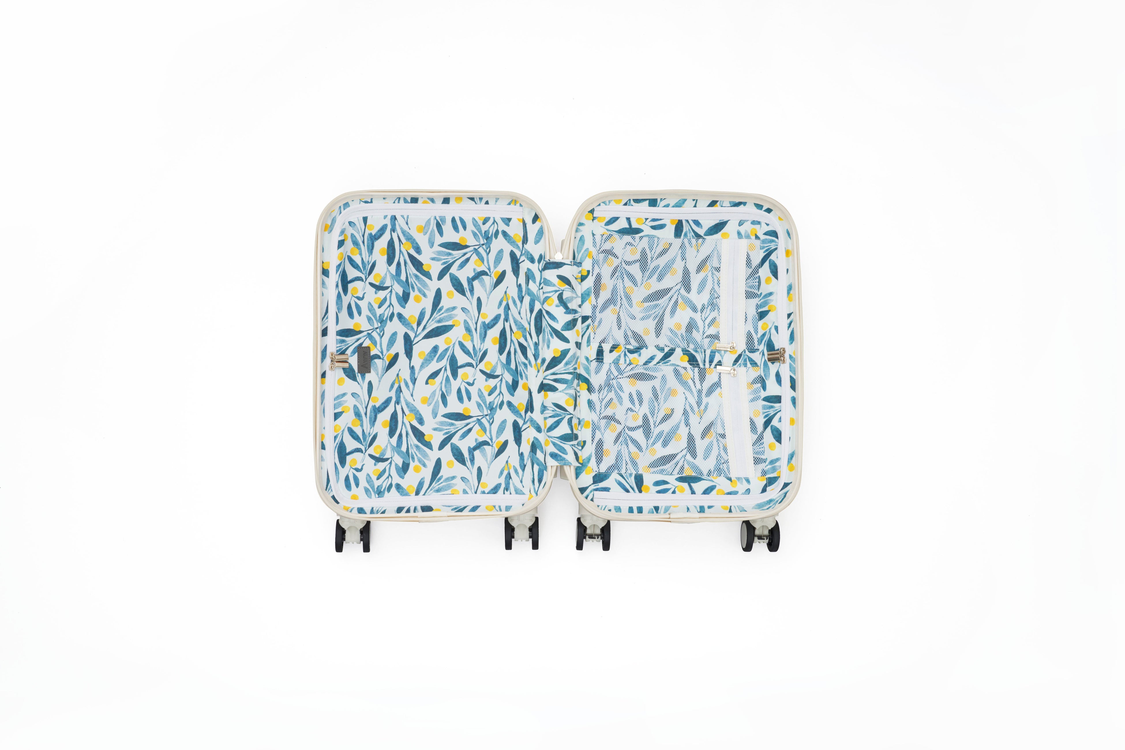 ミニマルなデザインの外装と対照的に華やかな内装デザインが映えるAwwのスーツケースは、それぞれ「カプリ島でのバカンス」「パリのブランチ」「飛行機の窓から見た空」「日本の枯山水」など、旅先で見る各地の情景からインスピレーションを受けています。主要航空会社で機内持ち込み可能なスモールサイズは2-3泊の旅行にちょうどいい大きさで、出張などでも活躍します。ボディはツヤ消しマット加工で傷が目立ちにくく、石畳でもスムーズに走行できる360度回転のダブルホイール4輪キャスターを採用。また、電車などでの不意な走行を防ぐワンタッチのキャスターロックと、盗難防止のダイヤル式ロック付きです。付属の大容量エコバッグはスーツケースへの装着も可能で、旅先のお買い物で荷物が多くなっても安心です。