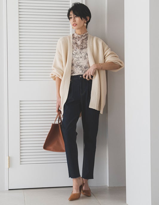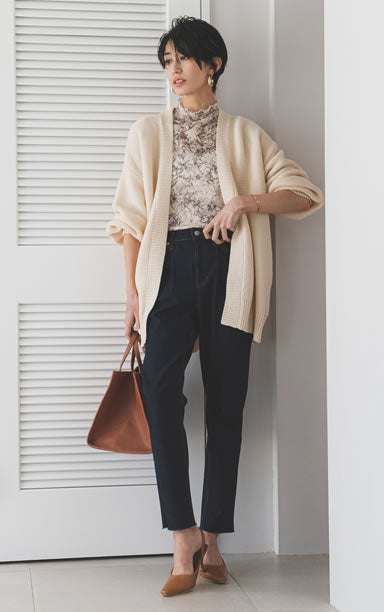 リサイクル繊維を採用したサステナブルなネイビーのエコデニムは、ベージュ&ブラウンカラーを併せて上品さを兼ね備えた大人のカジュアルスタイルに。花柄のシアートップスをINして「今っぽい」抜け感も抜かりなく。