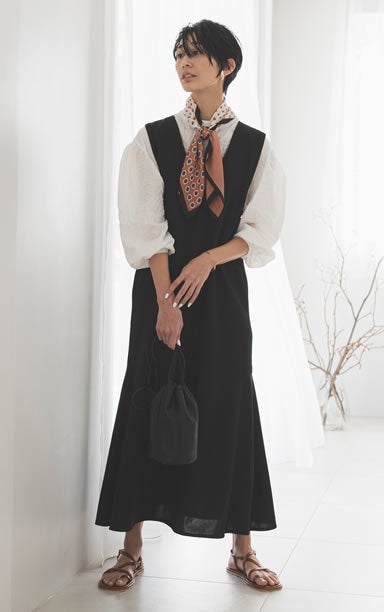 目まぐるしい日常を送る女性のライフスタイルに寄り添うイージーケア対応のジャンパースカートは、デイリーユースにぴったりなシンプルなルックスが魅力。華やかさをプラスするボリュームスリーブのブラウス&スカーフを合わせれば、日常を少し離れた特別感のあるスタイリングに。