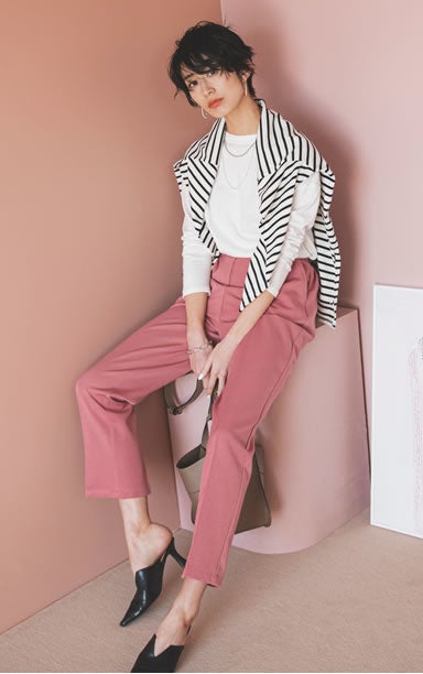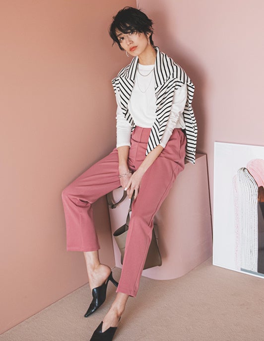 高揚感を与えてくれる感度高めのピンクカラーのパンツを主役にした、大人のカラーコーディネート。ラフなカジュアルさのあるカットソーやボーダーアイテムを合わせて、シャープさをプラス。表情も佇まいも華やかな印象に。