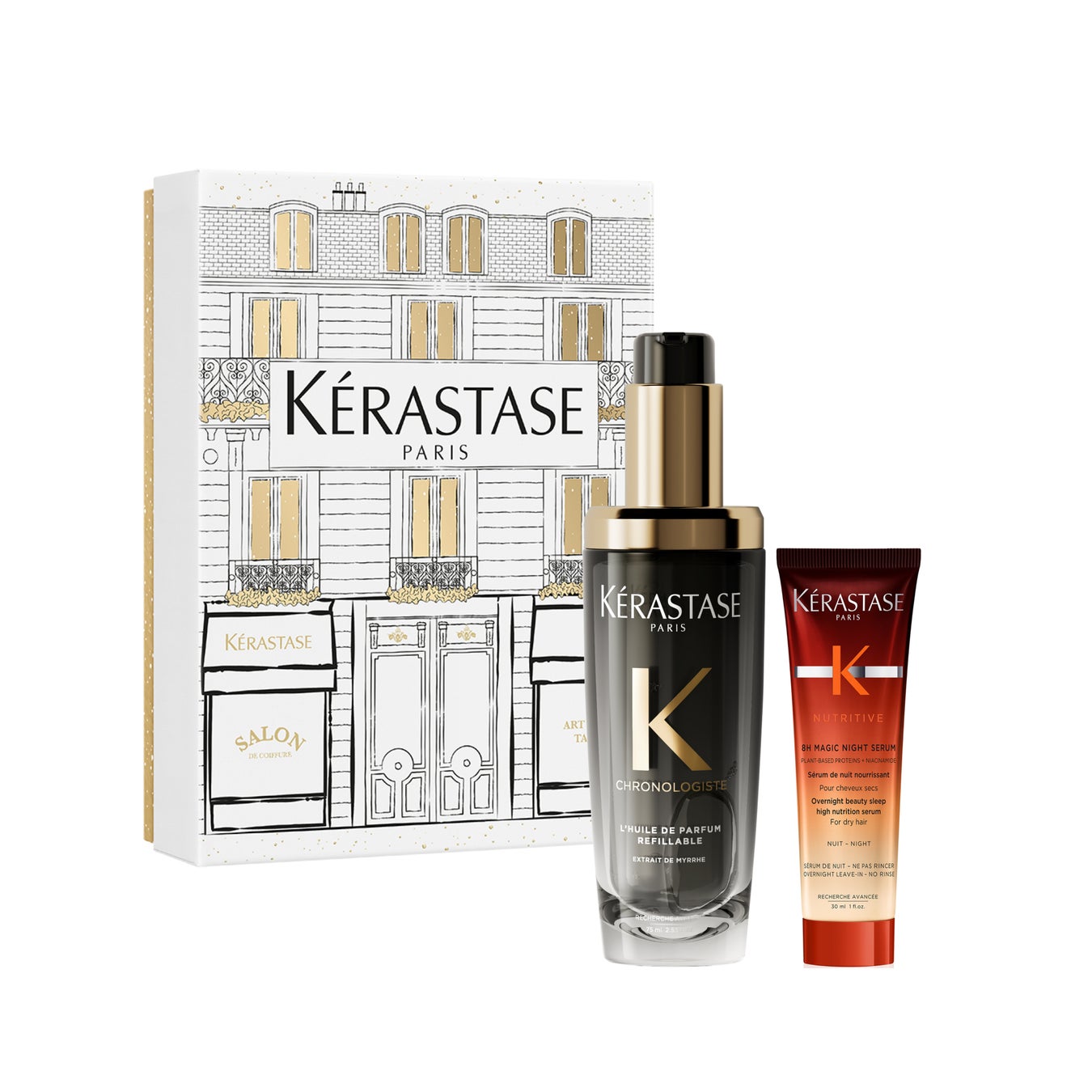ケラスターゼが厳選した人気製品を贅沢に詰め込んだ「ホリデーコフレ」が、この冬登場します。このホリデーシーズン、朝も夜もケラスターゼで贅沢なケア体験を。ケラスターゼ最高峰ヘアオイル “ユイル クロノロジスト”と夜間用ヘア美容液 “マジック ナイト セラム”が入った限定コフレ。外出時のダメージから髪を守り、寝ている間に集中ケアができる特別なセットをあなたの手に。日頃の感謝を伝える贈り物として、また、一年頑張ったご自身へのご褒美として特別な体験を。