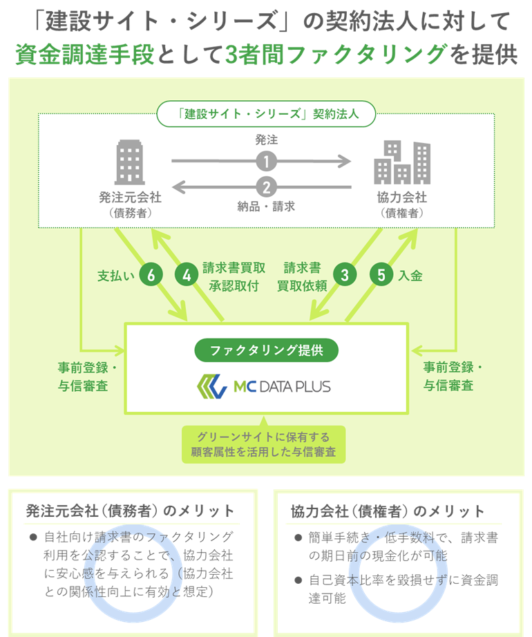 株式会社MCデータプラス(東京都渋⾕区、代表取締役社⻑:瀧田晃一)は建設業向けに提供するクラウドサービス「建設サイト・シリーズ」で集積したデータを活かし、業界課題の一つである資金調達の解決を目的に、ファクタリング事業のサービス実証に着手しました。