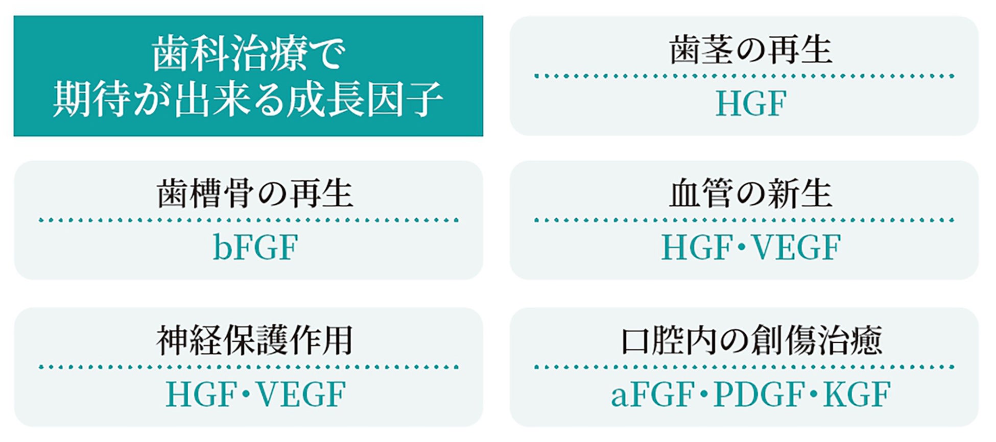 歯周組織における、細胞増殖の促進や形態形成誘導、血管新生などに関わっています。