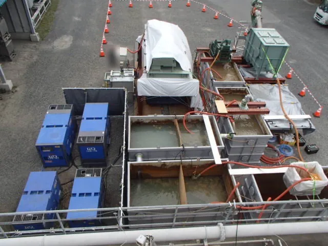 このような仮設脱水プラントを稼動させることにより、既設水処理設備に堆積した汚泥をそのまま廃棄してしまう方法に比べ、廃棄物の量を6,000㎥から150㎥まで約1/40まで減容化できました。また、処理も年度内に間に合わせることができました。