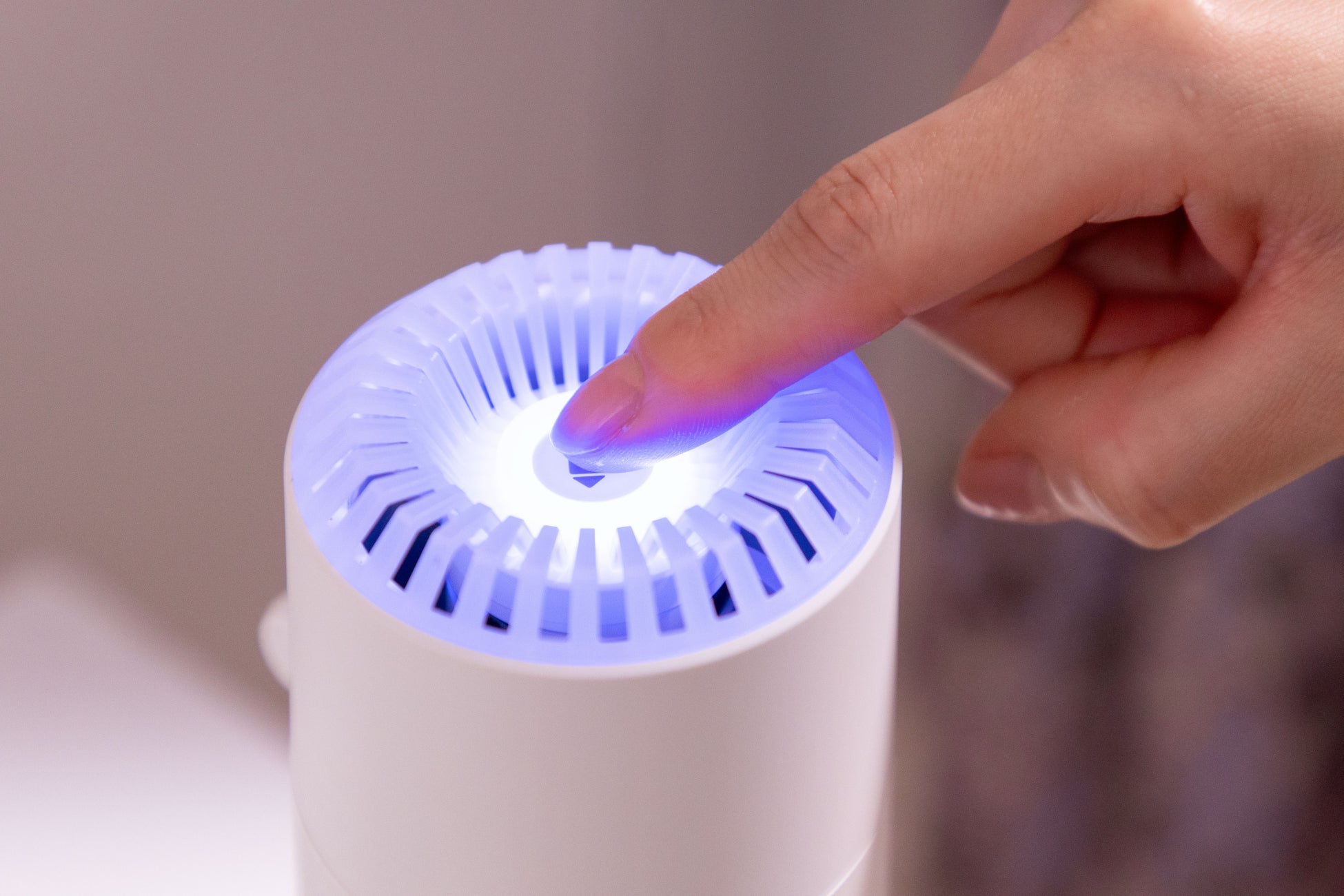 Airdog mini本体の天面にある「エアドッグマーク」を軽くタッチするだけで、風量の切り替えが可能になりました。(主電源は本体底面にあります)