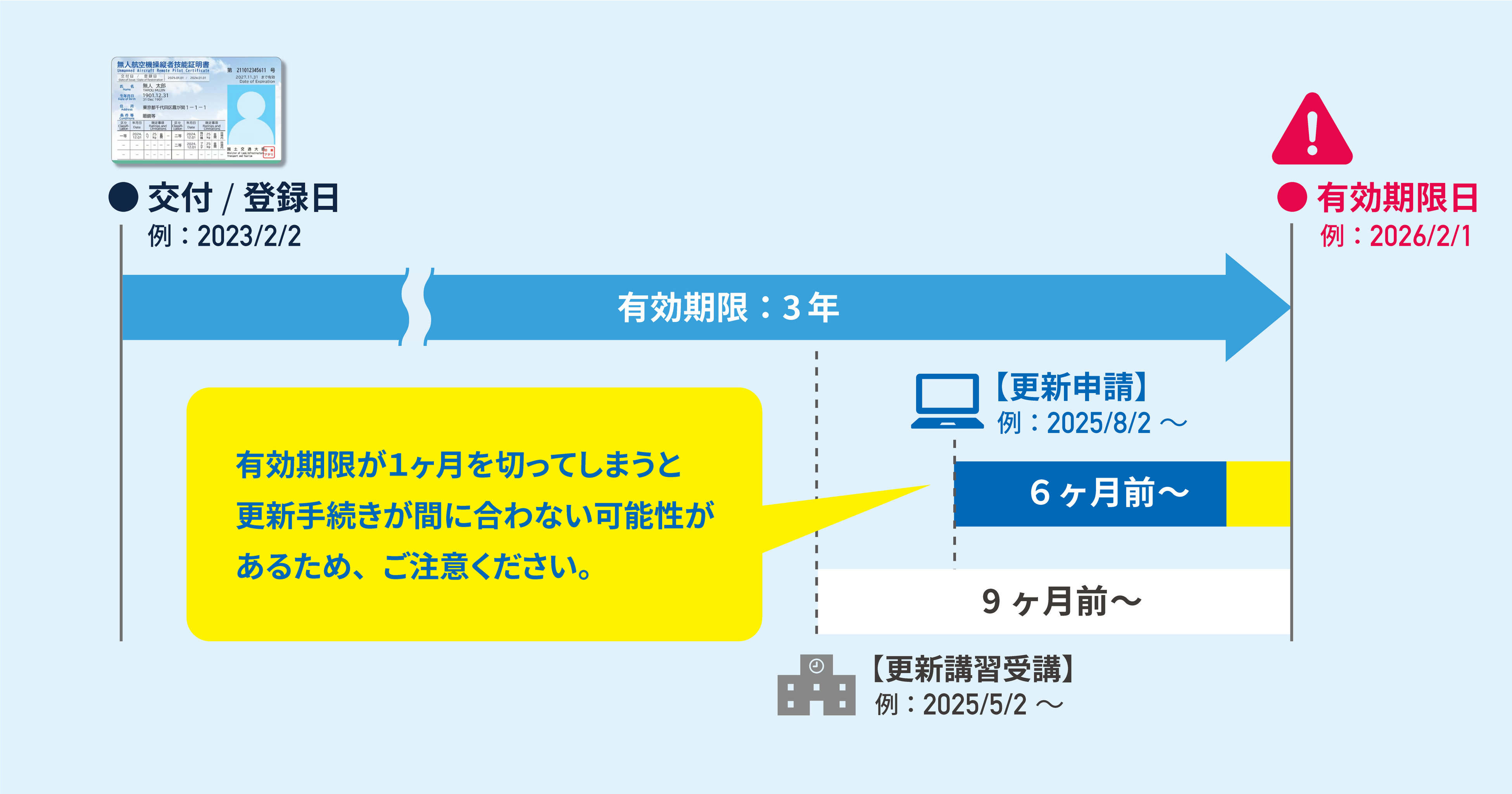 講習は所持資格の有効期限の9ヶ月前から受講可能ですが、更新手続きが可能となるのは、有効期限の6ヶ月前からとなっています。期間に余裕をもって手続きを行ってください。