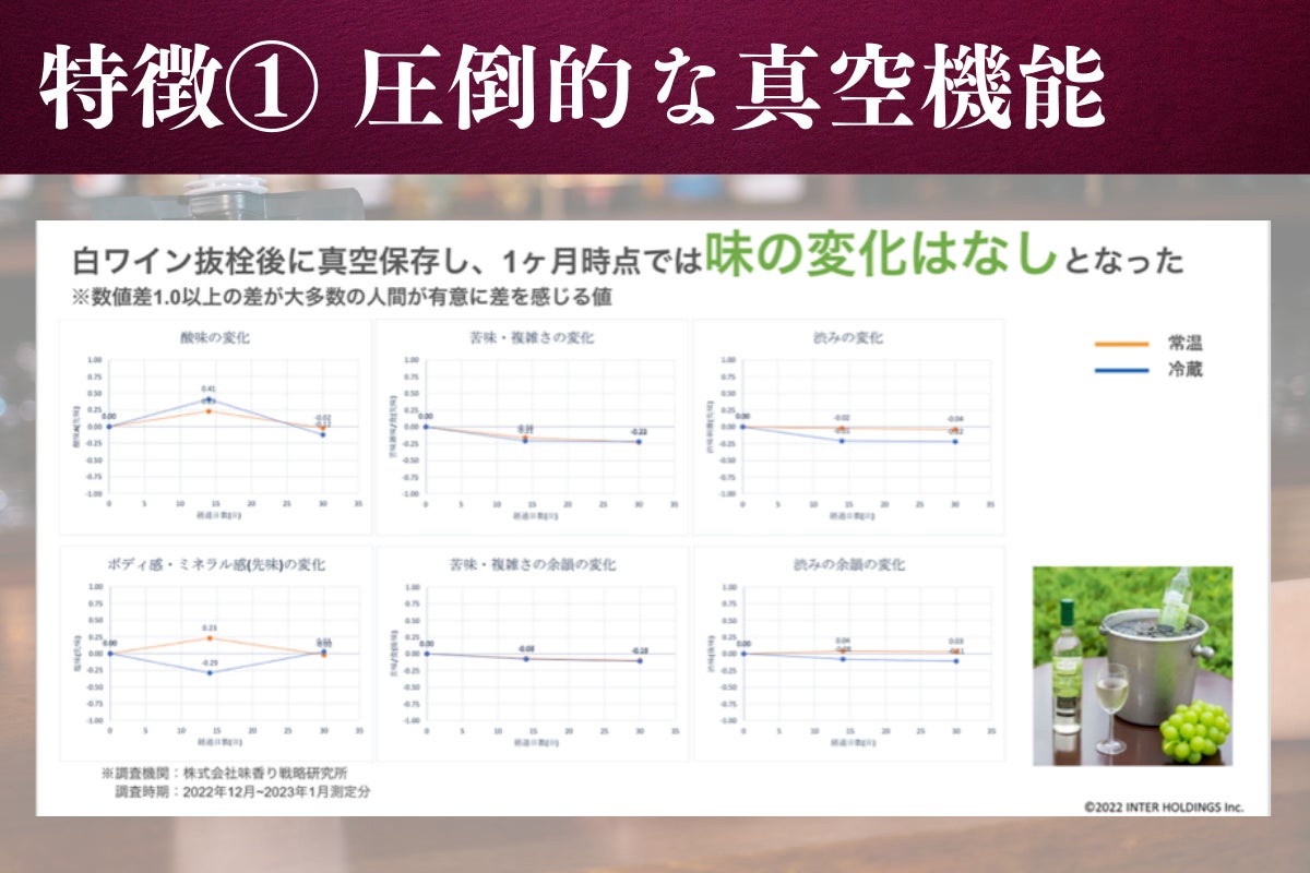 食品の「味」を数値化する手法を用いて味をわかりやすく表現し、12万件を超える味覚データベースを基軸に食にまつわるコンサルティングサービスを展開する株式会社味香り研究所の調べにより、開栓後のワインを当社の真空容器に詰め替えた状態でデータを取得したところ、常温保存・冷蔵保存ともに1ヶ月時点では味の変化はないというデータが取得できました。