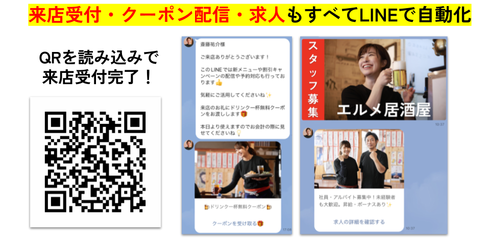 LINE友だちに向けて求人情報を流し、社員・アルバイトスタッフの採用もできます。