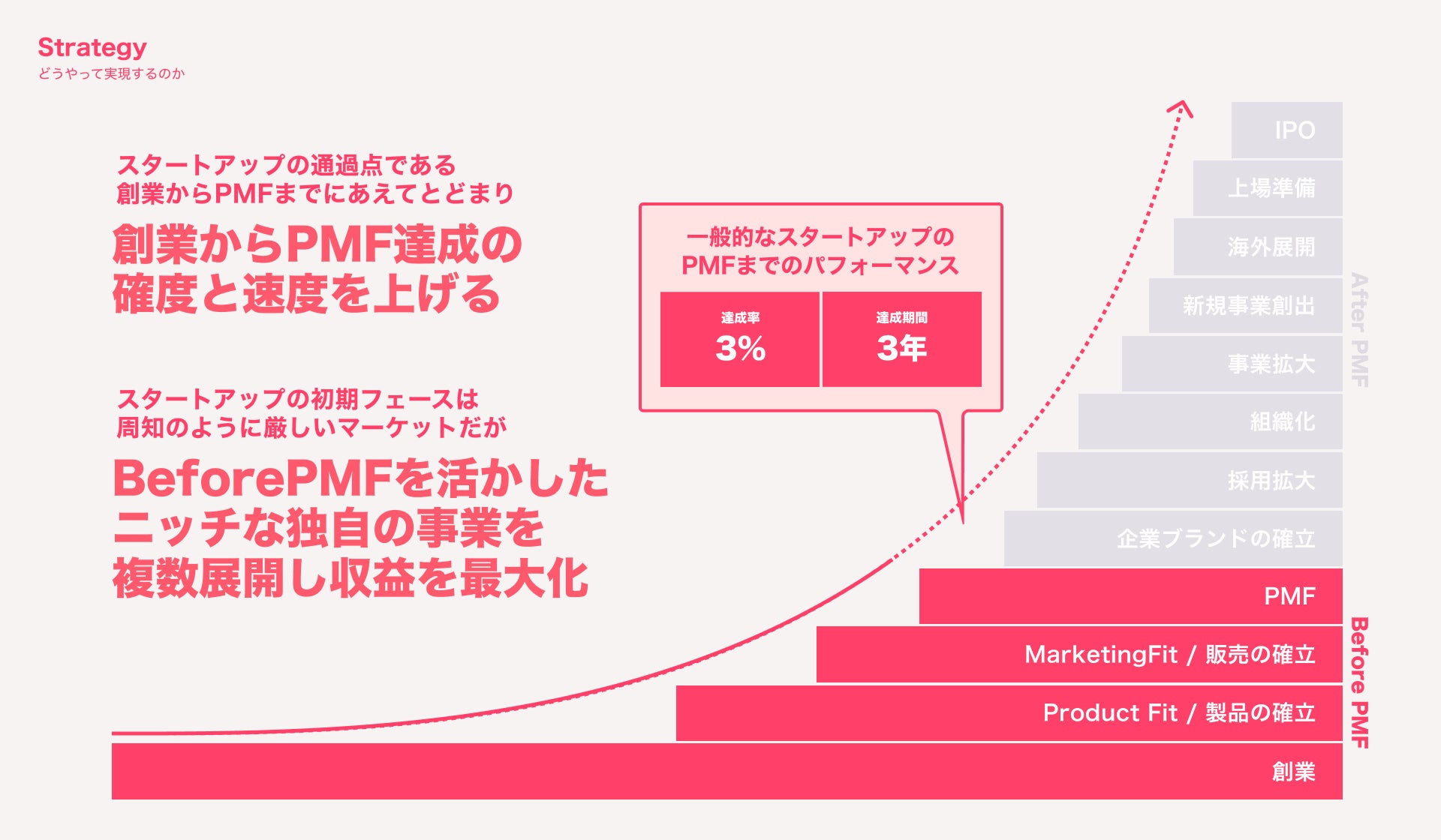 PMF(プロダクトマーケットフィット)に特化した独自のスキルとナレッジを構築することで、PMF達成の確度と速度を上げ、これによってPMFを達成するスタートアップを増やし、良質なスタートアップの量産していきます。