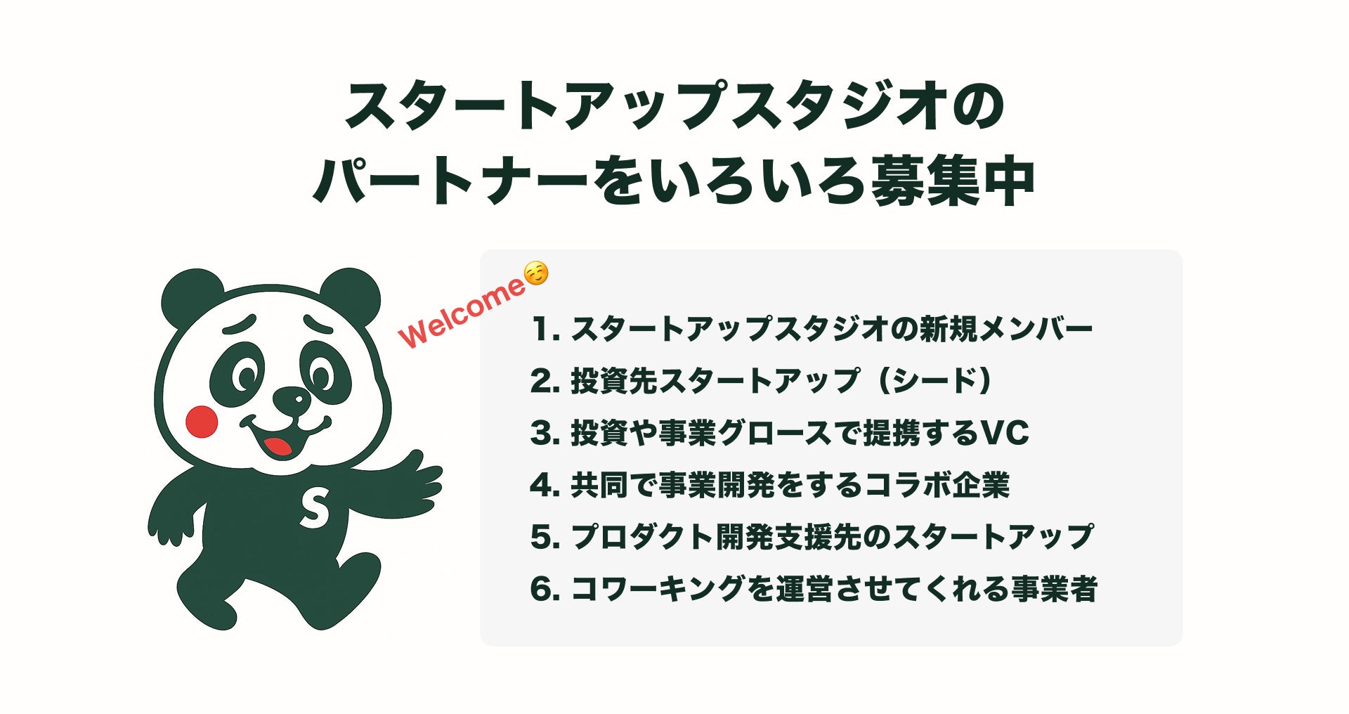 SEREALは世の中にまだ数少ないビジネスモデルである、スタートアップスタジオの成立に挑戦しています。日本のスタートアップスタジオのデファクトスタンダードになるため、以下のようなパートナーを募集中です。