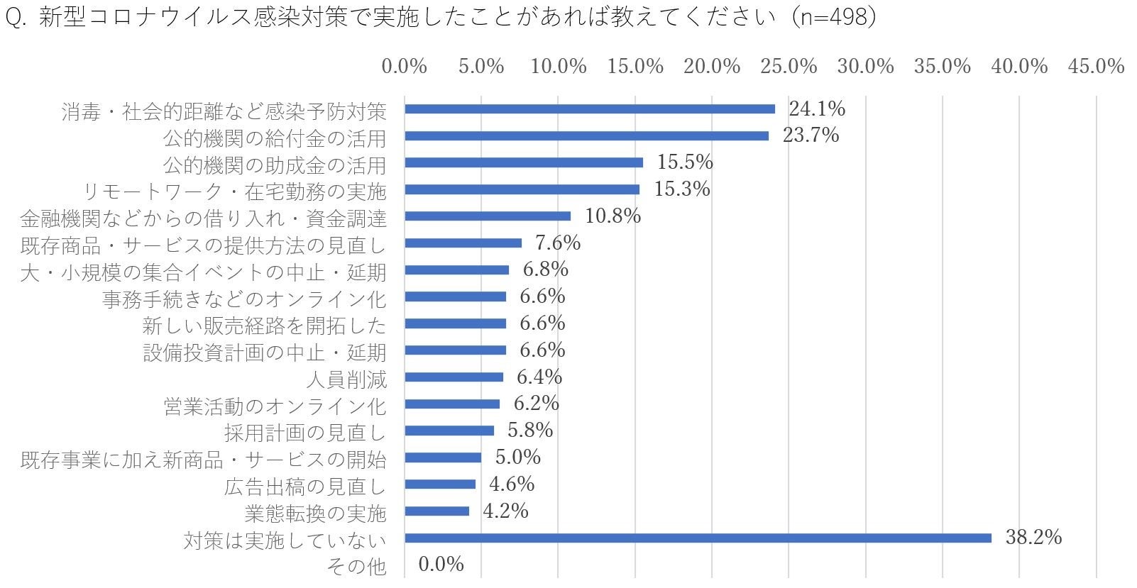・コロナ対策は「未実施」が最多の4割(38.2%)、次いで「感染予防対策(24.1%)」「公的機関の給付金の活⽤(23.7%)」