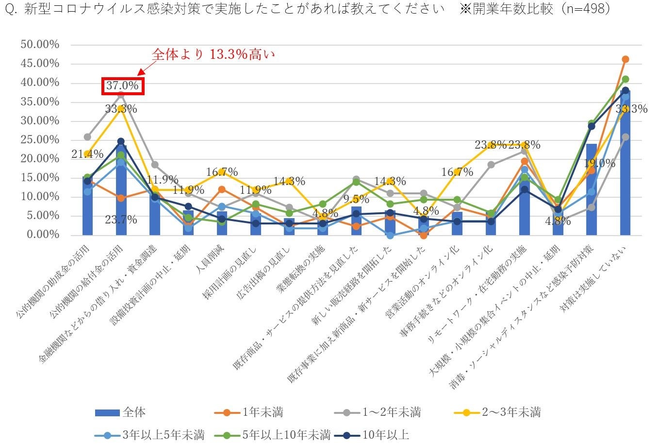 「公的機関の給付金」の活⽤が最も高いのは、独立1~3年未満の経営者で全体(23.7%)と比較して13.3%も高い結果に。