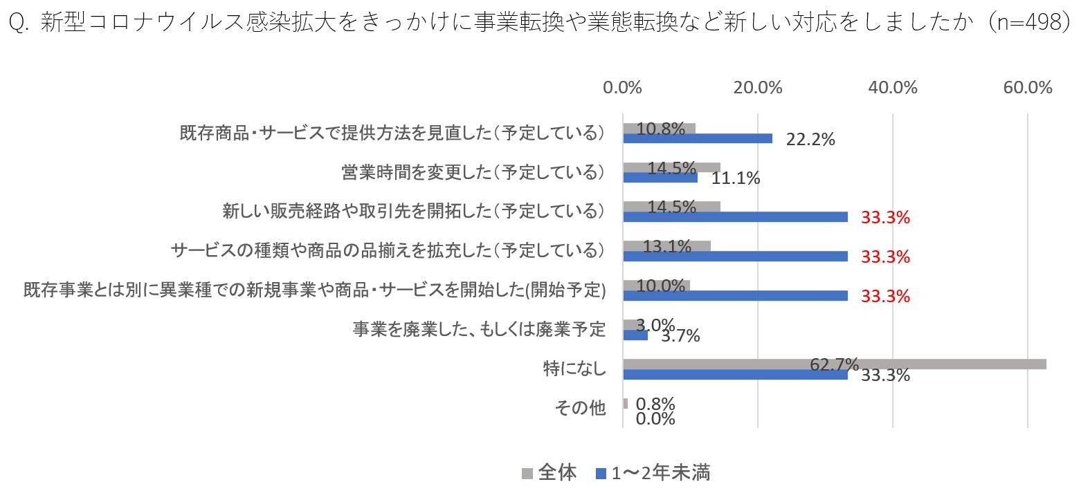 ・独⽴1~2年未満の経営者が最も対応に踏み出している結果に(66.7%)、「新しい販売経路や取引先を開拓」「サービスの種類や商品の品揃え拡充」「事業転換や業態転換」全てで33.3%の実施実態だった