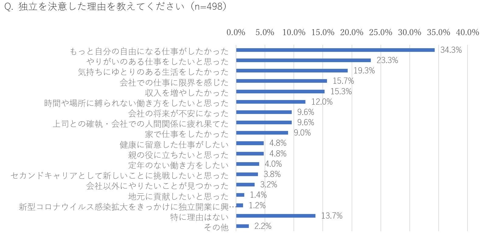 ・独⽴を決意した理由の1位は「もっと⾃分の⾃由になる仕事がしたかった(34.3%)」、2位「やりがいのある仕事がしたい(23.3%)」と、現職への不満が垣間見える