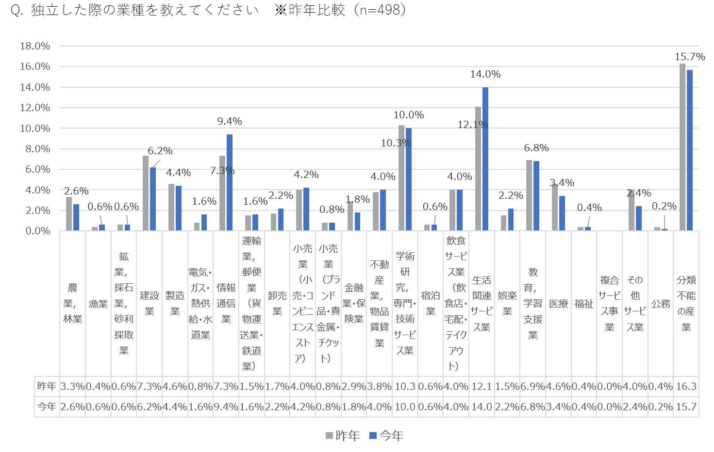 独立業種のトップ3は「生活関連サービス業※合算(14.0%/昨年比+1.9%)」「学術研究・専門・技術サービス業(10.0%/昨年比-0.3%)」「情報通信業(9.4%/昨年比+2.1%)」、最も伸長したのは「電気・ガス・熱供給・水道業」で前年比2倍