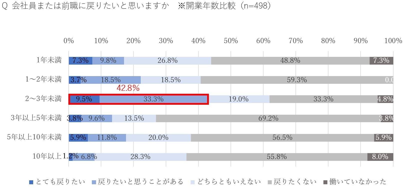 ・一方、独立2~3年未満の経営者だけ「会社員に戻りたい」が最も多く42.8%と4割(昨年比+7.1%)