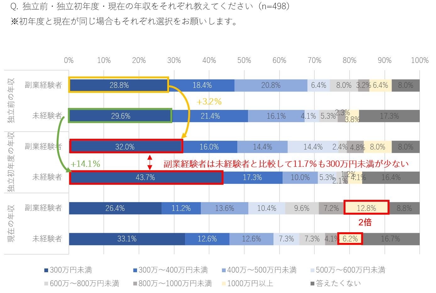 ・独立後の現年収1,000万円以上と回答した副業経験者は、未経験者の2倍。副業経験が経営成長にも影響