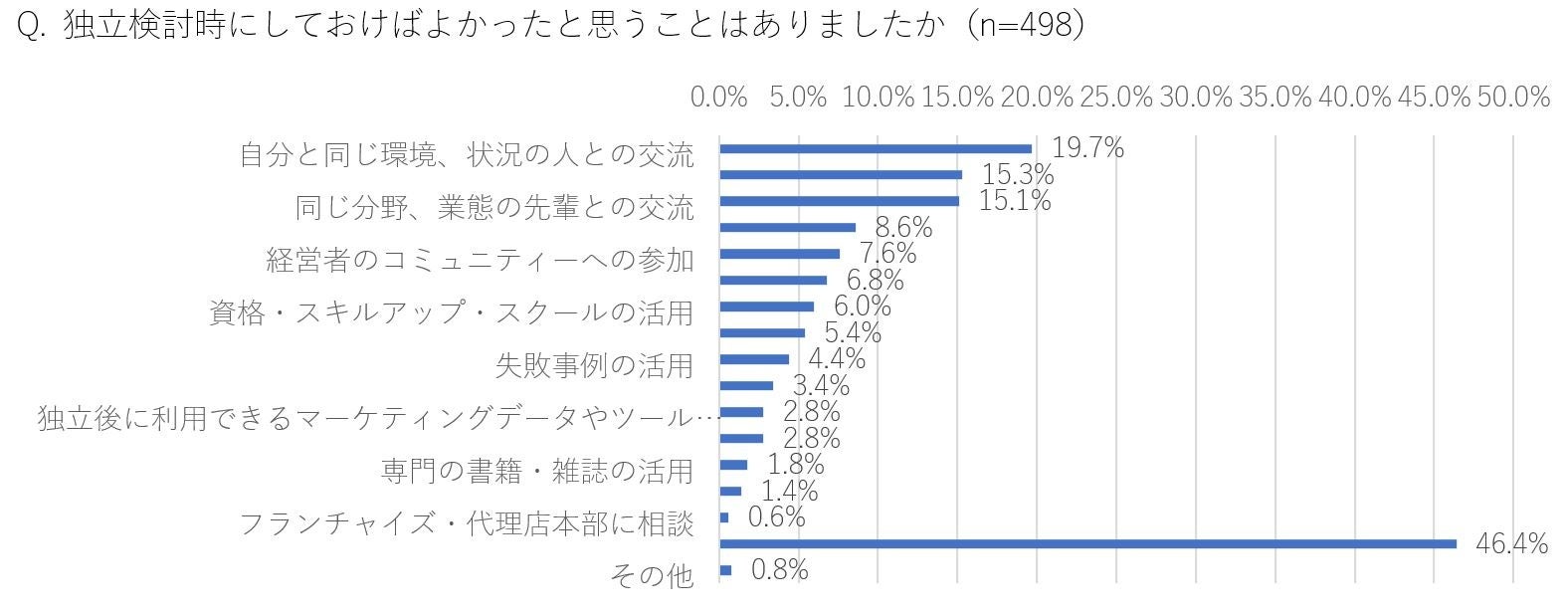 ・独⽴検討時にしておけばよかったことは「⾃分と同じ環境、状況の⼈との交流(19.7%)」「融資・助成⾦の知識習得(15.3%)」「同じ分野、業態の先輩との交流(15.1%)」