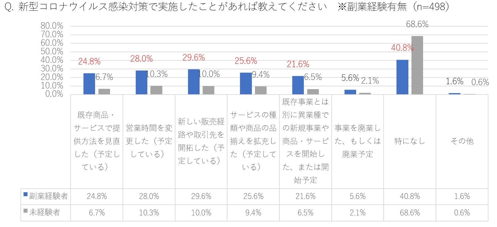 コロナ対策では「提供方法の見直し」「営業時間の変更」「新しい取引先の開拓」「品揃えの拡充」「異業種での新規事業の検討」において、副業経験者が未経験者より、それぞれ15%超高く「対応している」と回答し、コロナ下においても適応力の高さが際立つ