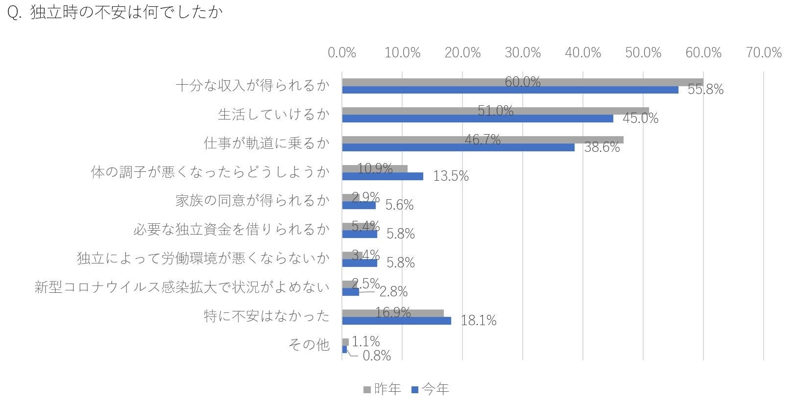 昨年とトップ3は変わらないが、全ての項目で比率を下げている。代わりに「体の調子が悪くなったらどうしようか(13.5%昨年比+2.6%)」「家族の同意が得られるか(5.8%昨年比+2.7%)」「独立によって労働環境が悪化しないか(5.8%昨年比+2.4%)」で伸長している。感染による体調不良は不安要素の一つ。