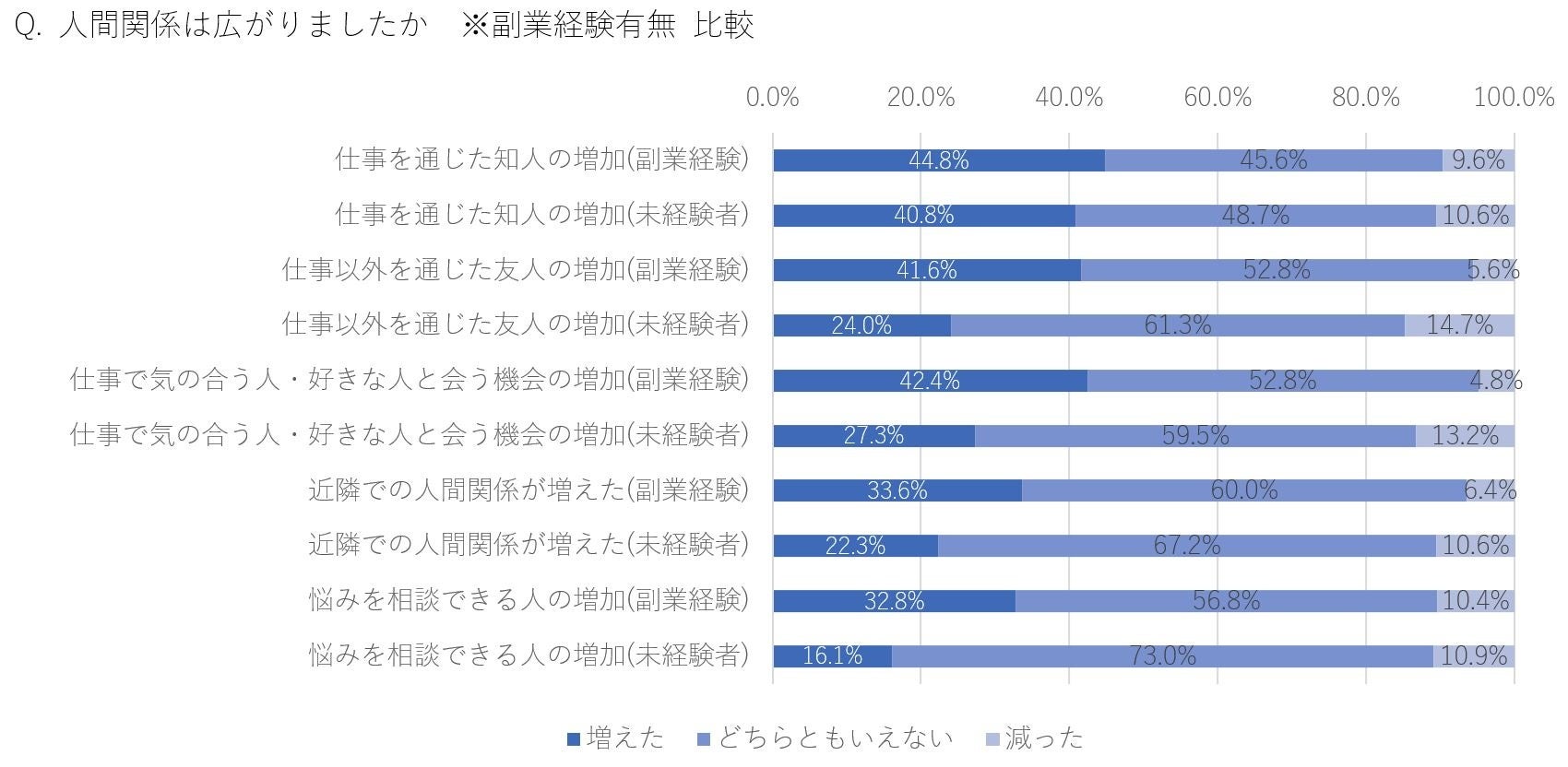 ・副業経験者は、人間関係の広がりの実感や独立後の家族・配偶者との関係性も良好という結果に
