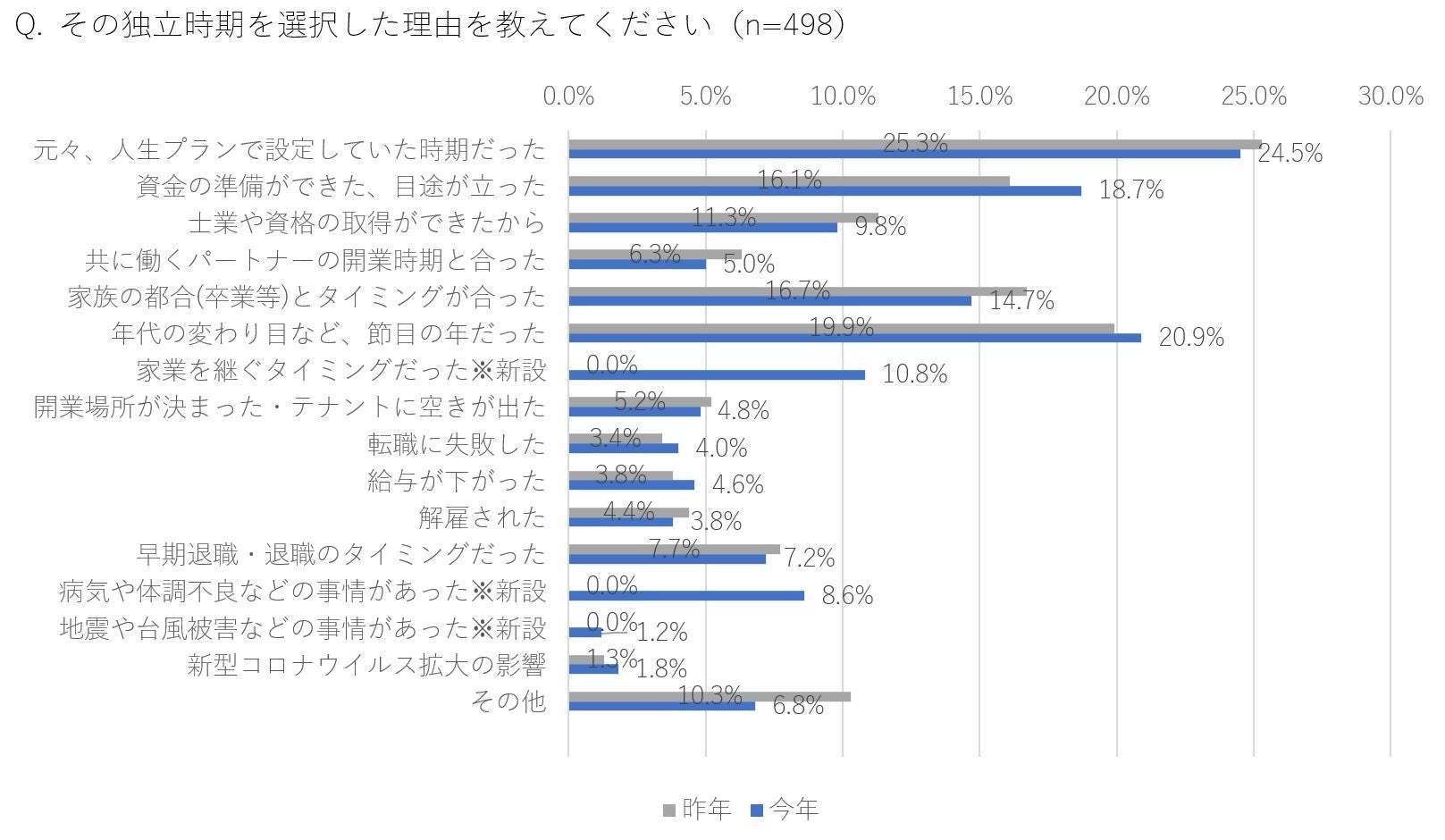 2位に「年代の変わり目など、節目の年だった(20.9%)」、3位に「資金の準備ができた、目途が立った(18.7%)」と続く。資金の準備については、昨年4位よりランクアップ(昨年比+2.6%)。コロナ下の自粛で独立に向けた資金作りの計画性が増したと推測される。